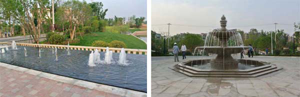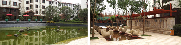 在紫荊東郡小區(qū),水景隨處可見,從主入口兩側(cè)近50米的景觀橋水景,到入口正前方一個(gè)大型的石雕噴泉,再到小區(qū)里面幾條主干道交匯的十字路口的小型地面噴泉,中心水景上的圓形石雕噴泉,特別是不遠(yuǎn)處的動(dòng)物噴泉雕塑,只只鶴低頭凝思,細(xì)長的水流從鼻端的出水口處流出,落入下方的水池里,更是格外引人注目。“這些水景小品具有的藝術(shù)特性與審美效果,加強(qiáng)了整個(gè)景觀環(huán)境的藝術(shù)氛圍,成為讓空間環(huán)境生動(dòng)起來的關(guān)鍵因素,在提高小區(qū)藝術(shù)品質(zhì)和景觀形象的同時(shí),更給人們帶來美的享受?!睏罱?jīng)理如是說。