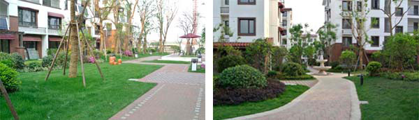 楊經(jīng)理說:“紫荊東郡的植物配置以統(tǒng)一中富于變化為原則,上層苗木主要選擇大規(guī)格的香樟、無患子和馬褂木等,中下層則以桂花、雞爪槭、紅葉石楠球、金森女貞球等常見的球類灌木及地被苗進(jìn)行組團(tuán),苗木的種類雖然不是很豐富,但在配置上卻形式多樣,特別是通過在施工時(shí)對設(shè)計(jì)的再深化,要求在植物種植時(shí),樹形、色彩、線條、質(zhì)地及比例都要有一定的差異和變化,顯示多樣性,但相互之間又有一定的相似性,從而使得整體的植物配置在和諧統(tǒng)一中顯得生動(dòng)活潑,簡單而不單調(diào),統(tǒng)一而不呆板,營造出一種寧靜、閑適的氛圍?!?/p>