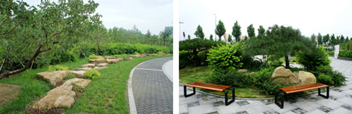 而在道路十字路口的節(jié)點處,則主要是用10cm×10cm的小花崗巖鋪地,鋪出來的路面整潔、平坦,看似簡單,實則對施工技術(shù)要求相當(dāng)高。草坪中的地面鋪裝,則采用花崗巖汀步,用錯縫鋪裝法,兩塊花崗巖之間用草皮鑲嵌,就像給每塊花崗巖鑲了一道綠邊,與旁邊的草坪和諧地融為一體。貫穿整個工程的游憩步道,全部采用“人字形”的鋪裝方法,中間用透水磚、兩邊以花崗巖鑲邊,透水磚價格不高,用以鑲邊的花崗巖是利用了鋪裝中剩余的邊料,雖然用料簡單,但通過對技術(shù)的嚴格要求,鋪出的路面卻整潔而不失韻味,是一種實用、環(huán)保、節(jié)約的做法。
