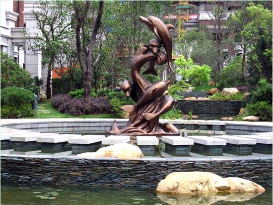 景觀小品是景觀中的點睛之筆,一些造型優(yōu)美的藝術(shù)小品,更是讓空間環(huán)境生動起來的關(guān)鍵因素。在保利·拉菲,帶有濃郁意大利氣息以及中西文化合璧的景觀小品隨處可見。入口處的歐式水景幕墻利用中國黑、黃銹石燒面、砂巖雕花巧妙結(jié)合,形成一幅精美的藝術(shù)畫面,幕墻中不斷噴涌的水流激起陣陣白色的漣漪,將后面寫有“保利·拉菲”字跡的景墻襯托得清爽大氣,在陽光照耀下,呈現(xiàn)出流暢、動感的畫面。特別引人注目的是模仿圓明園四大獸首制作的水景雕塑,牛首、豬首、猴首、虎首這四大獸首,形象上采取了西方動物的特征,融合了中國的傳統(tǒng)文化與西方的特色魅力,當(dāng)細長的水流從四大獸首的口中源源不斷地吐出、落入前方的水池里時,就與從下而上噴出的涌泉形成互動,一上一下、一細一粗,前方再配以色彩絢麗的花草,形成一處動靜相宜、格調(diào)清新的水景。