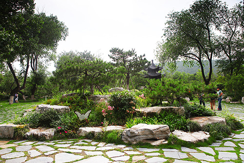 特別是鵠鳴谷,充分利用原有地形,在制高點(diǎn)建立六角重檐亭,即珠山亭,形成全區(qū)的觀景點(diǎn),地面用80mm厚的灰石板自然面亂鋪,縫隙50mm左右,中間種植草皮,通過增加其他的植物配置,與原有的榆樹、法桐等大樹一起,形成古樸、清幽、自然的原生態(tài)景觀群落,成為景區(qū)中的一大亮點(diǎn)。