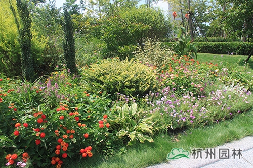 人來(lái)人往的杭州火車東站西廣場(chǎng),草坪碧綠,樹(shù)木蔥郁,更有一座名為“西湖印象”的立體花壇吸引著眾多游客的眼。而在廣場(chǎng)通往天城路方向的一片草坪里,一處100平方米左右的花境小品卻格外引人注目,紅黃粉交相輝映的五色梅、葉秀花艷的香彩雀、紫色優(yōu)雅的翠蘆莉、飄逸秀氣的小兔子狼尾草、青翠挺立的直立冬青、葉色嫩黃的黃金香柳……豐富的品種,艷麗的色彩,既展現(xiàn)出植物的色彩美,又營(yíng)造出豐富的群落美,使得這處小花境成為這片風(fēng)景的點(diǎn)晴之筆。