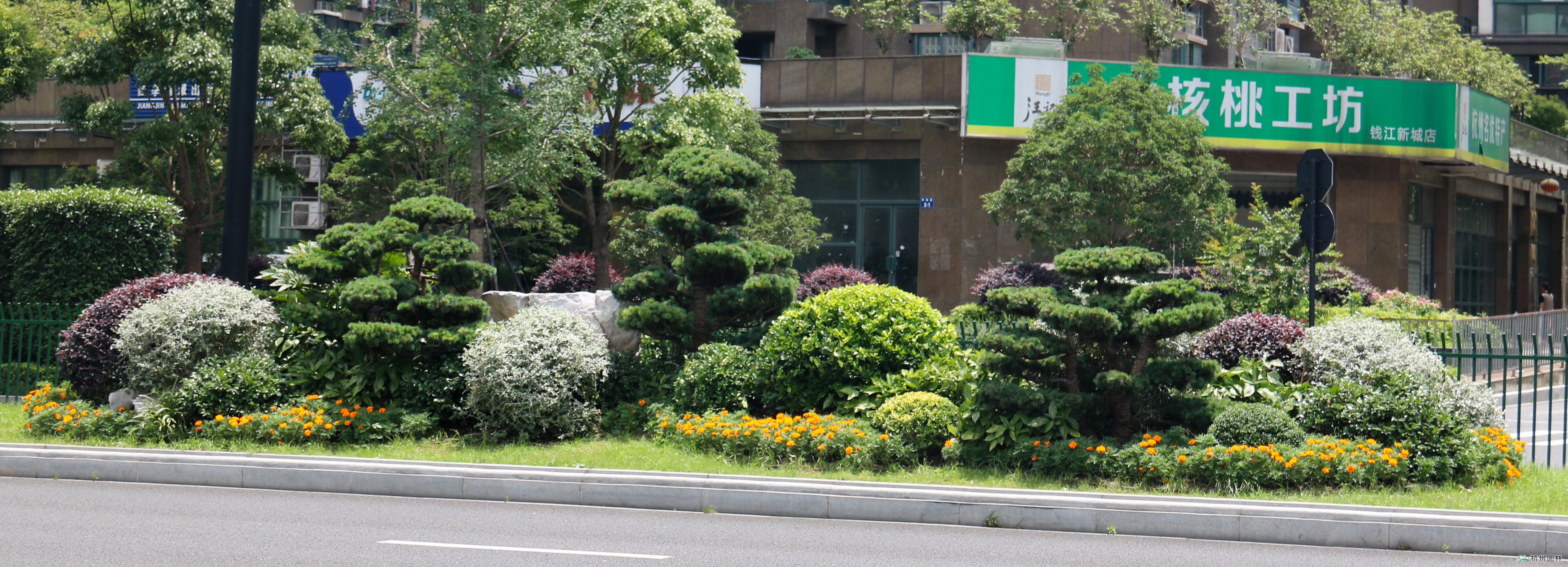 在道路十字路口及一些重要節(jié)點,則通過造型樹、球類植物、景石等的有機(jī)結(jié)合,采用盆景化的造園手法,景觀效果獨具特色。從而使得新塘路成為四季常綠、三季彩葉、全年花開不斷的“最美”迎賓大道。