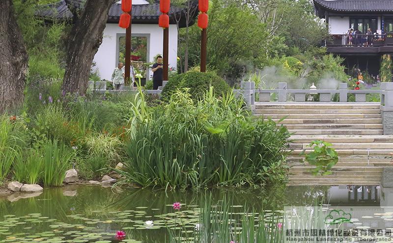 位于展園北側(cè)湖面上的新型生態(tài)浮島,采用框架結(jié)構(gòu)與木本植物相結(jié)合的漂浮花壇技術(shù),在浮力大的新型高分子材料浮槽上鋪設(shè)種植基質(zhì),配置厚皮香、芒草、千屈菜、再力花、梭魚(yú)草、旱傘草、美人蕉等植物,形成優(yōu)美的水上景觀。并結(jié)合岸邊和水中的旱柳、千屈菜、黃花鳶尾、水蔥、香蒲、菖蒲、蘆葦、荷花等水濕生植物,營(yíng)造出豐富多變的湖面景觀,同時(shí)起到凈化水體的生態(tài)環(huán)保效果。