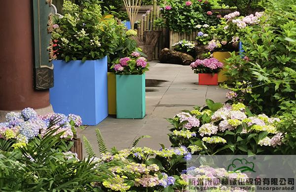 在城隍閣二樓平臺,杭園股份贊助的50余個品種、近400余盆的繡球花也將驚艷亮相,通過豐富的造景方式,充分展現(xiàn)繡球花的魅力。不管是種植在色彩明艷的花箱中,還是與枯木、竹籬笆、瓦片等的搭配,繡球都展現(xiàn)出絕美的風(fēng)姿,吸引著人們探尋的目光,忍不住拿起相機(jī)或手機(jī),留下一個個精彩瞬間。其中,花大色艷、色彩可調(diào)的大花繡球‘搖擺樂’、‘藍(lán)寶石’,矮小可愛,青澀潔白的圓錐繡球‘活力青檸’,花如寶塔、葉形如掌的重瓣櫟葉繡球‘雪花’等,是杭園股份今年主推的品種,表現(xiàn)都非常搶眼。