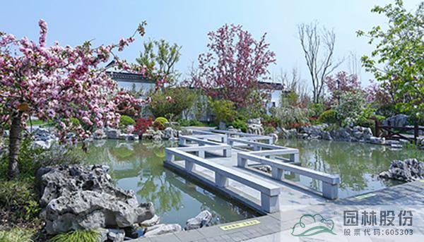 曲折的小橋?qū)@中的水系一分兩半,一邊是平面的水面,一邊是層層跌落的流水,動(dòng)靜結(jié)合,意蘊(yùn)悠遠(yuǎn),帶給人們更加豐富的景觀(guān)體驗(yàn)。而不同的植物配置手法,也讓海棠顯得更加豐姿婥約,優(yōu)美動(dòng)人。