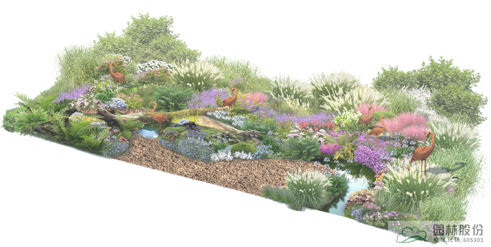 以千鳥(niǎo)花、密花千屈菜、美女櫻等觀賞草本花卉為主,點(diǎn)綴以小兔子狼尾草等觀賞草,重現(xiàn)濕地草甸中繁花似錦的美麗場(chǎng)景。