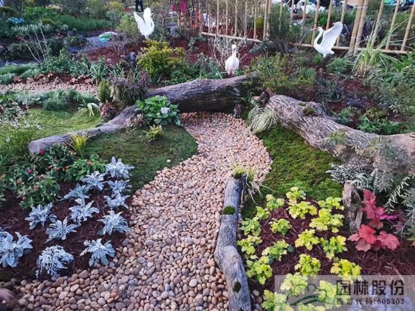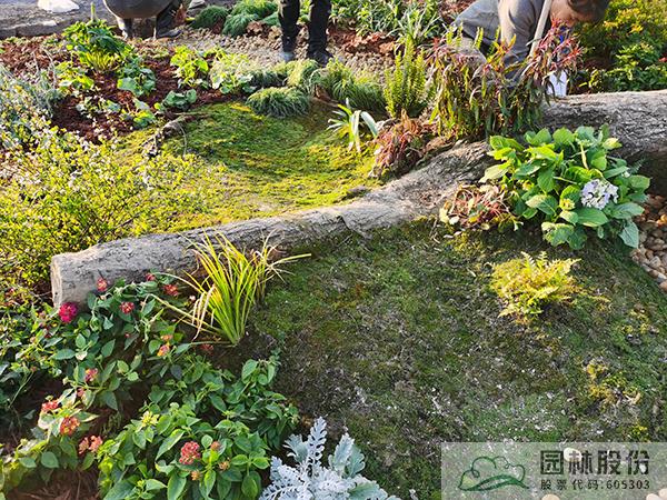 ①模擬苔蘚植物的生境條件,將蘚類濕地景觀與枯木結(jié)合,在枯木與卵石道路交叉部位布設(shè)小水塘,保持苔蘚生長(zhǎng)環(huán)境土壤濕度。
