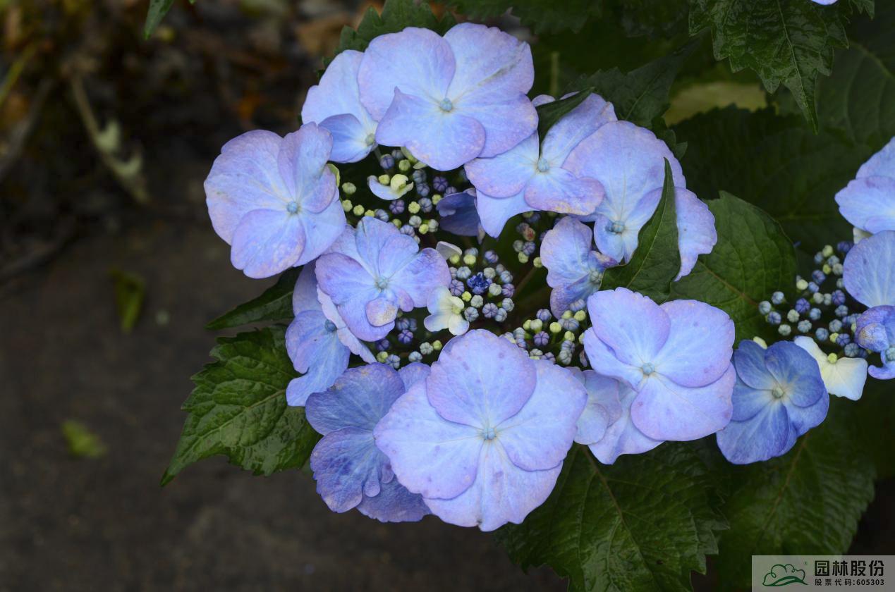 大葉繡球品種間雜交品種;葉片卵形,中綠色;盤(pán)狀花,萼片(花瓣)巨大,花色為深紫粉色至鮮紫藍(lán)色,添加調(diào)藍(lán)劑時(shí)可變?yōu)樯钭纤{(lán)色。花開(kāi)時(shí),宛如一只只蝴蝶在枝頭翩躚,靈動(dòng)多姿。杭州5月上旬開(kāi)花,可延續(xù)至6月下旬。