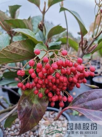 忍冬科莢蒾屬,落葉灌木,高可達3米。葉暗綠色,聚傘花序,單個花序徑較小,花冠白色,花期3-4月。核果球狀卵形,果量大,色彩從黃色漸變成橙色,最后轉成紅色,觀果期可長達5月。冬季至早春可修剪。一年施肥3次,早春萌芽前,花后及秋季。該種耐干旱,適合工程應用或庭院觀賞。