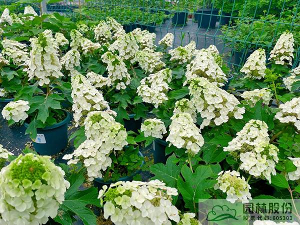 虎耳草科繡球?qū)?,落葉灌木;成株高度100-150 cm,成株冠幅 80-150 cm;葉片掌狀,長寬接近,3~7 裂;花期6-10 月,圓錐花序,花朵密集型,盛花時碩大醒目的花序可達(dá) 30 cm 以上,初期翠綠色,中后期花色逐漸轉(zhuǎn)白,秋季晝夜溫差大會使其逐漸暈染上粉紅色;老枝開花,成年植株花期觀賞效果極佳,花后修剪,平時只需修剪重疊枝、病殘枝即可,以免影響第二年開花;耐熱耐寒,喜溫暖和偏蔭蔽的環(huán)境,微酸性土壤;株型高大,枝條挺拔,樹冠寬闊豐滿,花球碩大;櫟樹一樣的掌狀葉片,到秋季會轉(zhuǎn)變?yōu)樯罴t色,紅葉期一般從每年的深秋至次年的5月,是一種既可觀花、又可賞葉的彩葉灌木。