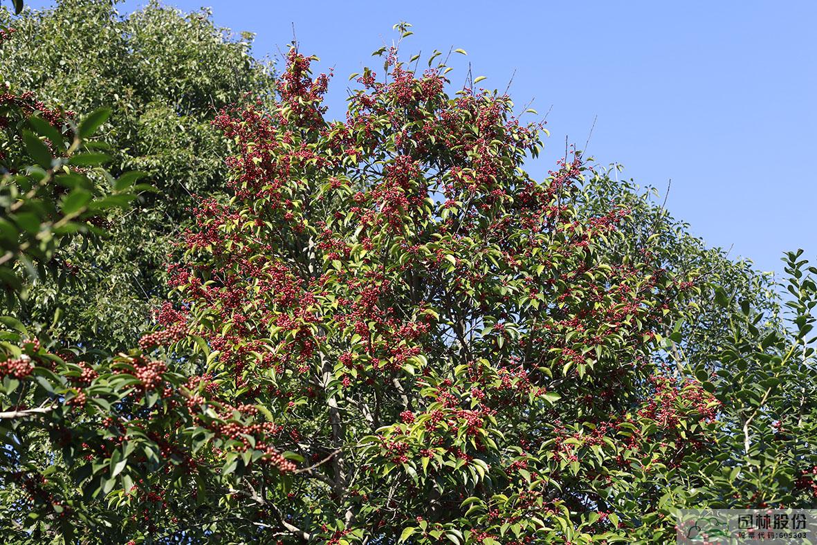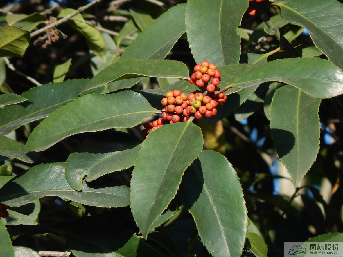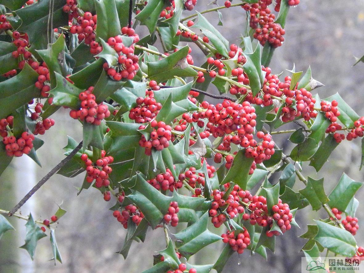 鐵冬青:其葉子四季常青,故名鐵冬青。為常綠喬木或灌木,高可達(dá)20米,葉全緣。果實紅色,紅若丹珠,小巧可人。掛果期長,能從10月一直持續(xù)至來年3月。因有多子多孫,興旺發(fā)達(dá)之意,在民間俗稱“萬子千紅樹”。樹皮或根皮為中藥“救必應(yīng)”,具清熱解毒,利濕的功效。為優(yōu)良觀果樹種,適宜在園林中孤植或群植。